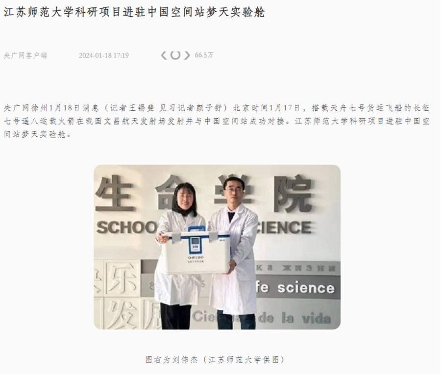 1月19日央广网报道我校刘伟杰教授团队研究成果入驻空间站,报道内容如下: