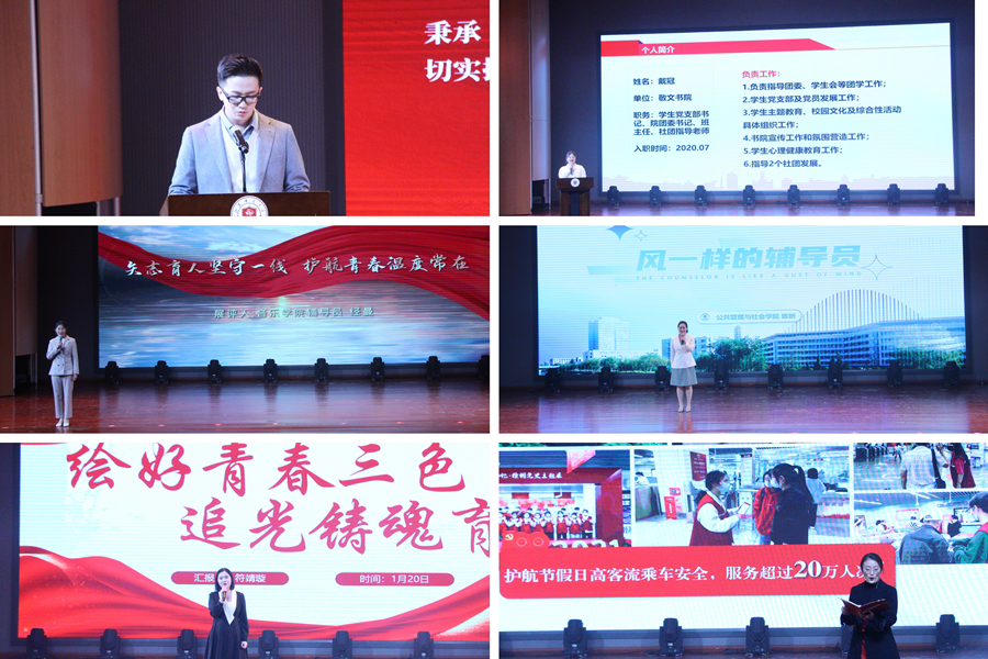 经辅导员个人申报、学院推荐、考核领导小组材料审核等环节,全校共有18名辅导员进入优秀辅导员现场展评环节。会上,参评辅导员围绕履职情况、工作理念、工作成效等方面进行了汇报,讲述了与学生同心同向共同奔赴成长之路的故事;解读了辅导员作为摆渡人永葆初心的重要意义;介绍了自己助力学生成长成才的工作经验;汇报了结合专业特色点燃精准育人思政炬火的创新做法……风采展评展示了各位辅导员的育人故事,赢得了现场评委和观众的强烈共鸣和阵阵掌声。会上,辅导员们也带来了精彩的歌曲、器乐、舞蹈等节目。