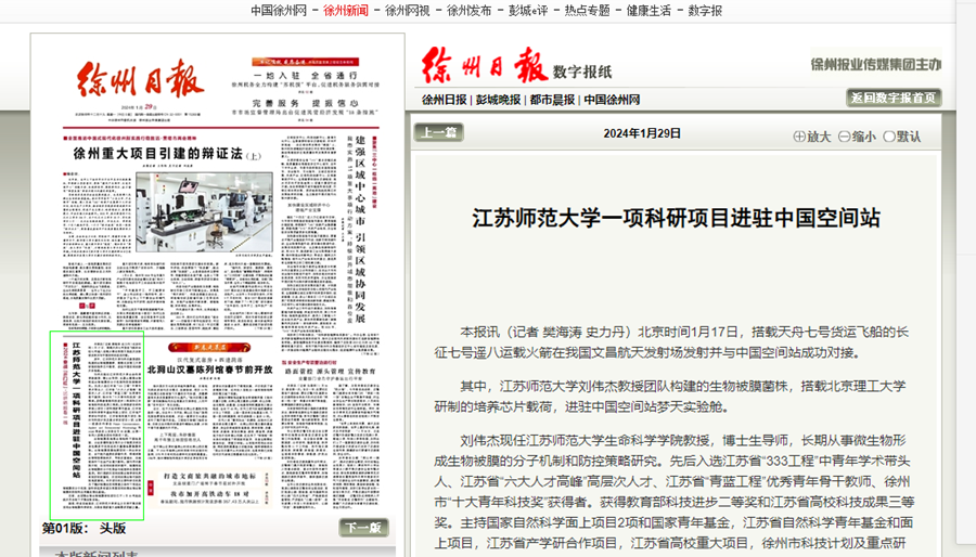 徐州日报1月29日报道我校科研成果入驻中国空间站,报道内容如下: