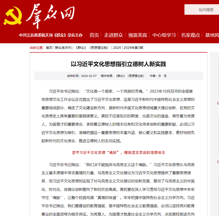 2月27日,校党委书记方忠在2024年第3期《群众》杂志发表署名文章《以习近平文化思想指引立德树人新实践》。文章围绕深入学习贯彻习近平文化思想,立足高校立德树人的根本任务和文化传承创新的重要职能,从坚守习近平文化思想“魂脉”,锤炼坚定忠诚的理想信念;赓续习近平文化思想“根脉”,锻造守正创新的价值观念;贯彻习近平文化思想“体用贯通”理念,推进立德树人生动实践三个方面有针对性地提出了思路举措,对高校校园文化建设具有重要指导作用。全文如下: