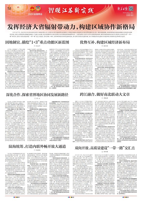 为贯彻落实习近平总书记在江苏代表团重要讲话精神,省重点智库我校“一带一路”研究院聚焦江苏高质量推进“一带一路”交汇点建设、省内全域一体化、省际毗邻地区协同发展新成效,深入探讨其背后发展机制,为江苏拓展开放发展新空间提供有力理论支撑和智力支持。《新华日报》3月9日在“2024全国两会智观江苏新实践”版面,以“发挥经济大省辐射带动作用,构建区域协作新格局”为题进行了专门报道,其主要内容如下: