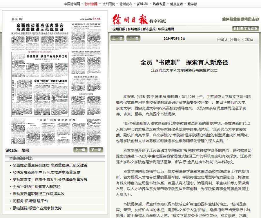 徐州日报3月13日报道我校科文学院成立书院,报道内容如下: