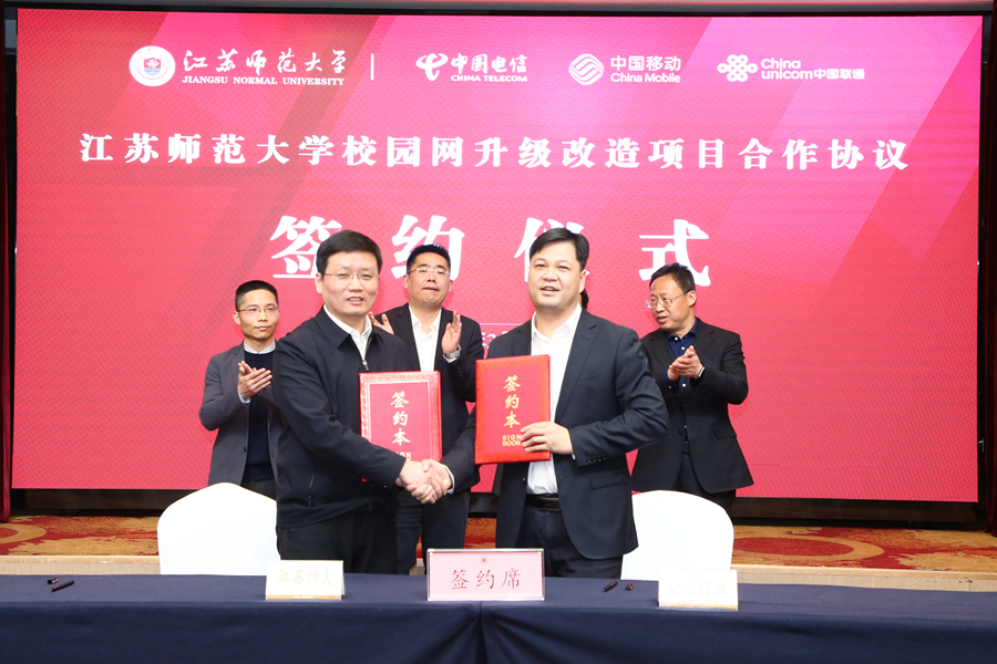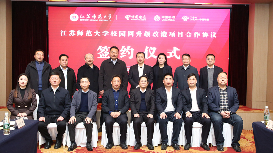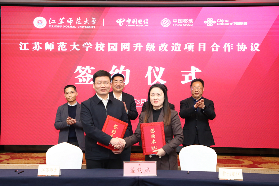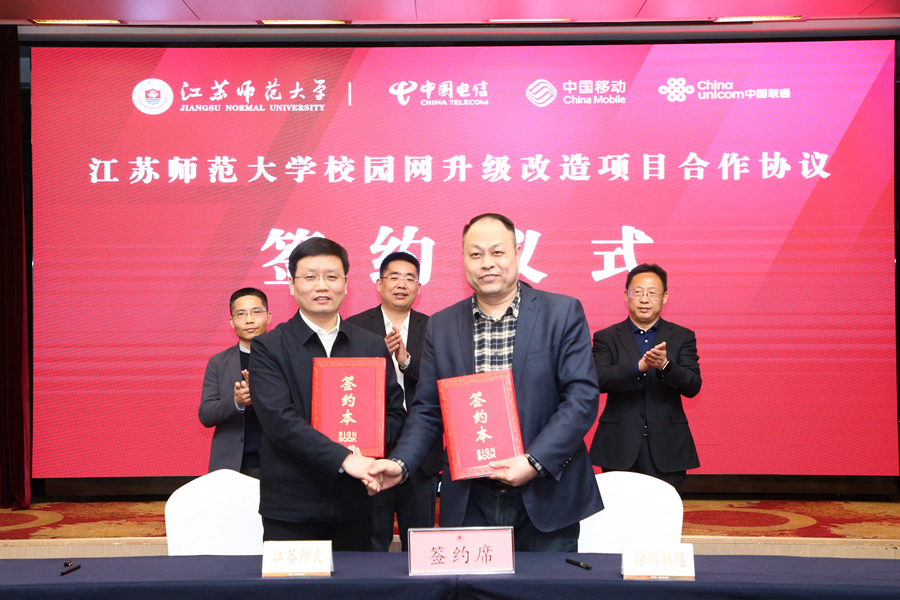 3月21日下午,我校与徐州电信、移动、联通三家运营商举行校园网升级改造合作协议签约仪式,校长周汝光、副校长商亮,中国电信徐州分公司总经理燕宪宏、副总经理刘伟伟,中国移动徐州分公司总经理徐星宇、副总经理赵翔,中国联通江苏分公司政企BG副总裁黄伟明、徐州分公司副总经理马桂军,校长办公室、后勤管理处、信息化建设与管理处、教育发展基金会办公室有关负责同志,以及三家运营商代表等参加了仪式。