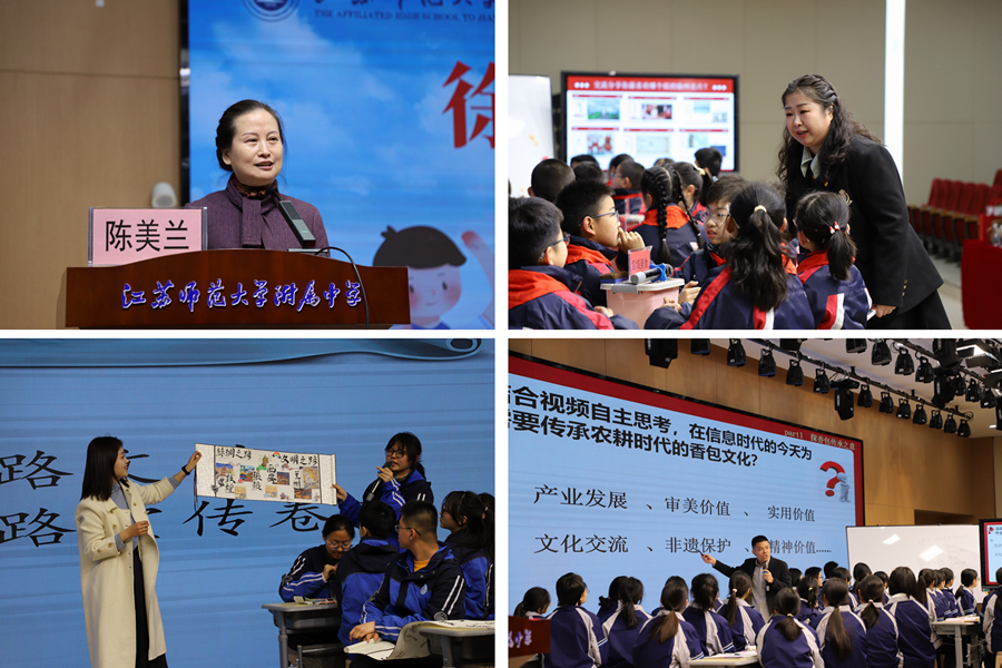 课例展示环节,江苏师范大学附属中学的老师们以“弘扬传承中华优秀传统文化”为主题同上一堂课。小学部教师周楠以“徐州名片我打造”为题,教育学生领略城市之美、传播城市之魅。初中部教师时雨菲以“延续文化血脉”为题,将丝绸之路作为整节课的线索,通过情景剧、头脑风暴等教学活动,促使学生领悟优秀传统文化之美。高中部教师高爱松以“弘扬优秀传统文化,建设文化强国”为题,设计“探寻香包的文化价值”总议题,探香包传承之意,寻香包传承之策,以学生熟悉的香包文化为线索,展示香包文化的地域特色,并以此阐述传统文化的特点、当代价值、面临困境以及如何走向世界。