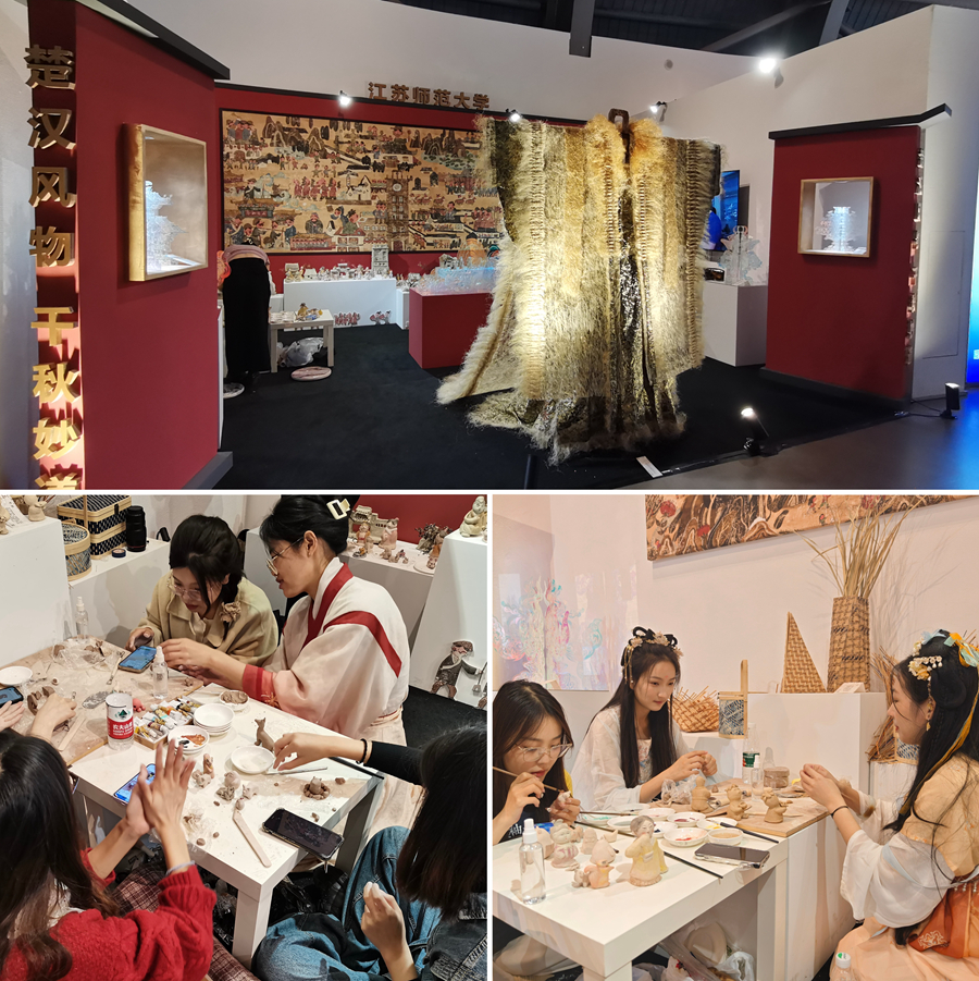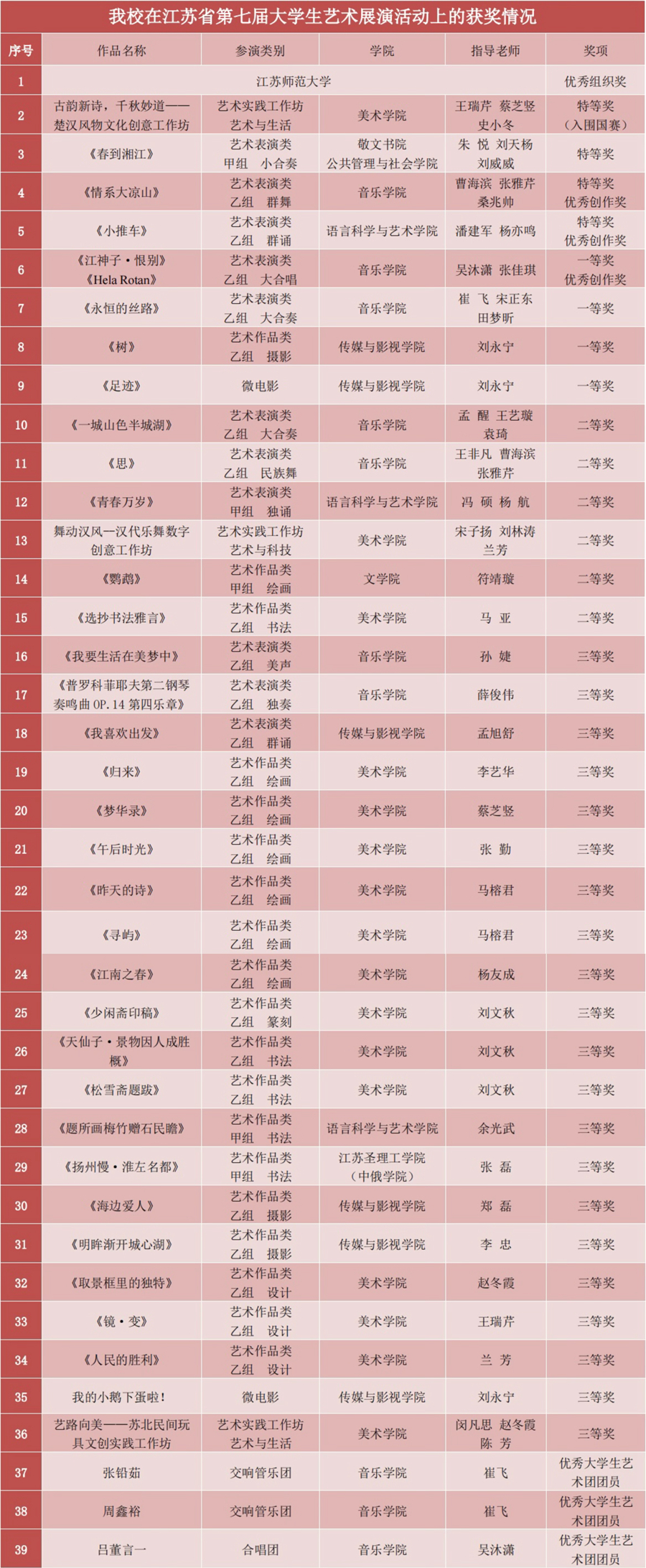 美术学院的“古韵新诗,千秋妙道——楚汉风物文化创意工作坊”荣获特等奖并入围国赛,该项目以楚汉风物的创新发展为主题方向,依托汉文化发源地徐州的风物特点,以在地性的视角对造物文化进行衍生与转化。音乐学院舞蹈团表演的原创舞蹈作品《情系大凉山》荣获特等奖及优秀创作奖,作品以我校大学生志愿者奔赴四川凉山彝族自治州布拖县普及普通话为主线,舞动民族团结进步主旋律,奏响铸牢中华民族共同体意识的时代强音。语言科学与艺术学院的原创朗诵作品《小推车》荣获特等奖及优秀创作奖,作品以淮海战役为背景,以小推车为线索,深刻诠释“人民”的战争伟力、军民团结的深深情谊。音乐学院教师作曲、合唱团演唱的《江神子·恨别》是苏轼离任徐州时的词作,荣获一等奖及优秀创作奖。此外,敬文书院、公共管理与社会学院学生共同表演的民乐小合奏《春到湘江》荣获特等奖;音乐学院交响管乐团表演的管乐合奏《永恒的丝路》荣获一等奖。