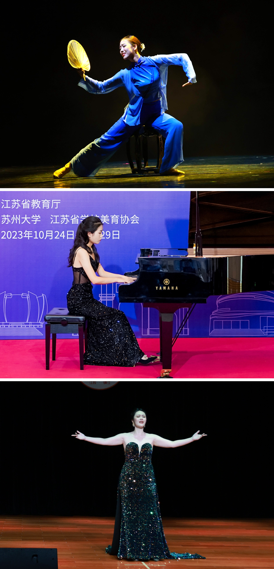 长期以来,学校高度重视美育工作,坚持美育在人才培养中的重要地位。本届展演活动自启动以来,我校党政领导高度重视,校团委(艺术教育中心)认真筹备,着力加强与相关部门、学院的协同配合,结合师范特色,举办我校师范生技能展演,创新开展首届青年才艺大赛暨江苏省第七届大学生艺术展演活动校内选拔赛,通过作品展示、评委评审、专家推荐等环节,推报优秀作品参加省赛。各参赛学院精心组织,全情投入,为作品创作、遴选、指导、参赛等提供宝贵支持。各参赛师生以高度的责任感和饱满的热情深入挖掘创作题材、不断打磨精品、开展集中训练,展现了较好的艺术修养和昂扬向上的精神风貌,生动诠释了苏师学子积极进取的价值追求。江苏省大学生艺术展演活动是我省目前规格最高、规模最大、影响最广的大学生艺术盛会,由省教育厅举办,每三年一届,本届展演活动以“厚植家国情怀,涵养进取品格”为主题,共分为艺术表演类(声乐、器乐、舞蹈、戏剧、朗诵)、艺术作品类(绘画、书法和篆刻、摄影、设计、微电影)、艺术实践工作坊、高校美育改革创新优秀案例等四大类别,按照非专业组(甲组)与专业组(乙组)进行比赛,集中展现当代大学生与时代同向、与祖国同行、胸怀家国、奋力筑梦的价值追求。