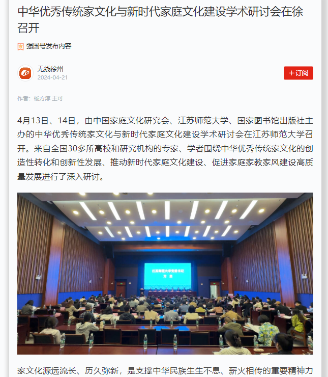 学习强国徐州平台4月21日报道在我校举办的中华优秀传统文化与新时代家庭文化建设研讨会,报道内容如下:
