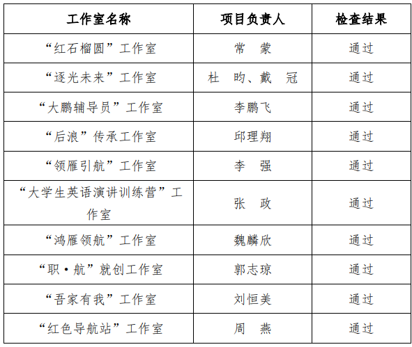 根据《关于申报优秀辅导员(班主任)工作室的通知》(苏师大学〔2022〕65号)文件精神和学校相关检查要求,学校对首批立项的10个辅导员(班主任)工作室的建设进展情况进行中期检查,现将检查结果予以公示:
