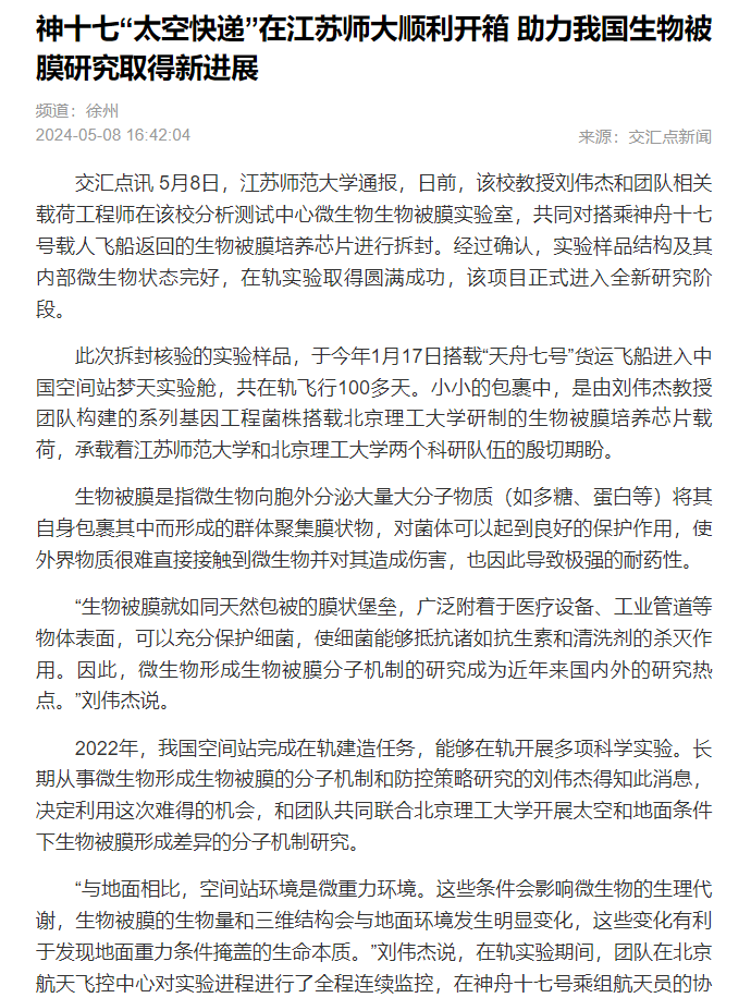 交汇点新闻5月8日报道我校刘伟杰老师科研项目从空间站返回,包括内容如下: