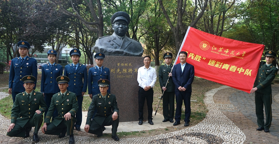 泉山区人民武装部军事科刘峰在成立仪式后做征兵动员宣讲,“先胜”迷彩青春中队成员代表拜谒刘先胜中将雕像。