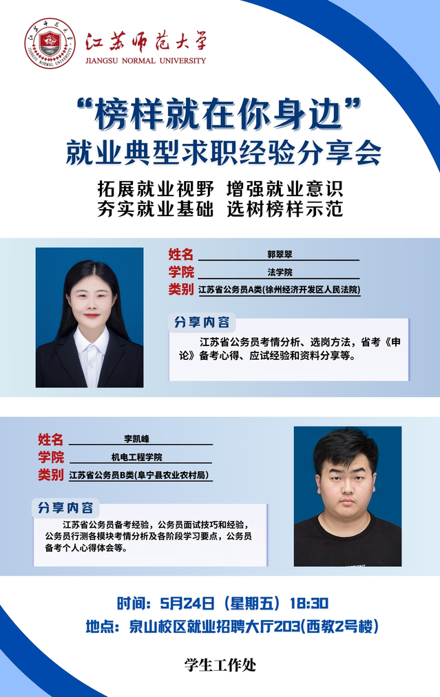 为增强学生就业意识,拓宽就业视野,夯实就业基础,学生工作处结合学生关注度高、求职意愿强烈的行业领域,开展“榜样就在你身边”就业典型求职经验分享会,充分发挥朋辈榜样的示范引领作用,帮助更多的学生提升就业竞争力。经学院推荐、学校遴选,现将第十期活动开展相关情况通知如下: