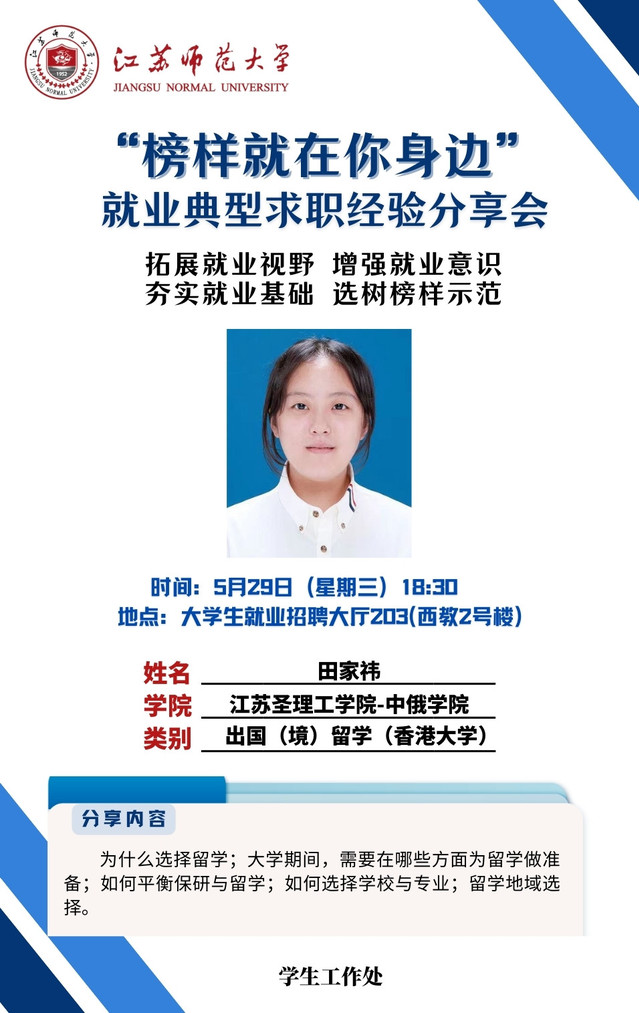 为增强学生就业意识,拓宽就业视野,夯实就业基础,学生工作处结合学生关注度高、求职意愿强烈的行业领域,开展“榜样就在你身边”就业典型求职经验分享会,充分发挥朋辈榜样的示范引领作用,帮助更多的学生提升就业竞争力。经学院推荐、学校遴选,现将第十一期活动开展相关情况通知如下: