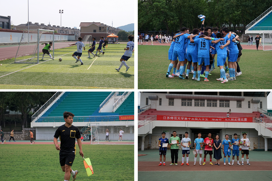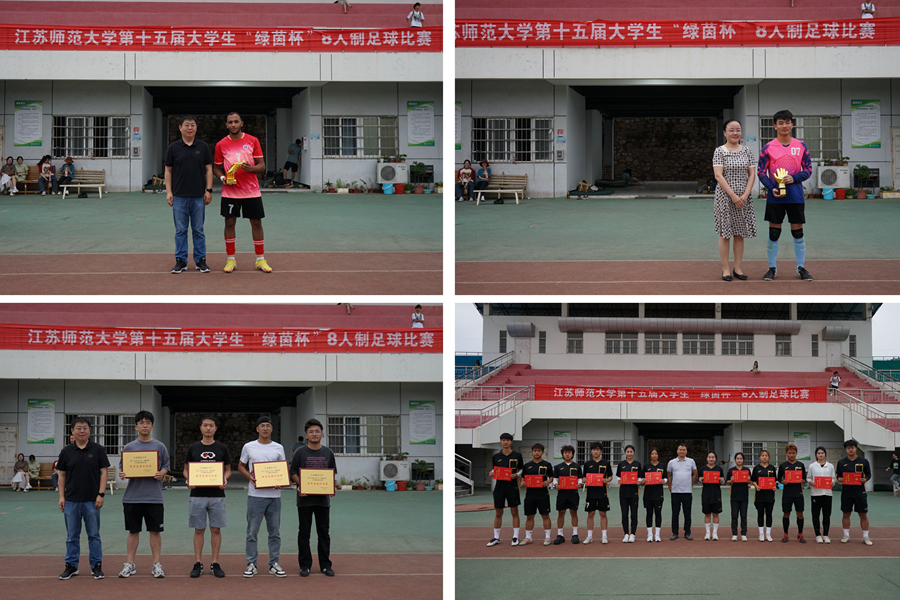 5月29日下午,江苏师范大学第十五届大学生“绿茵杯”8人制足球比赛圆满闭幕。本次比赛由江苏师范大学体育运动委员会主办,校学生工作处、校团委协办,体育学院承办。赛程历时8天,进行了52场比赛,共有来自机电工程学院、国际学院、科文学院、敬文学院等20支代表队的270名运动员参赛。