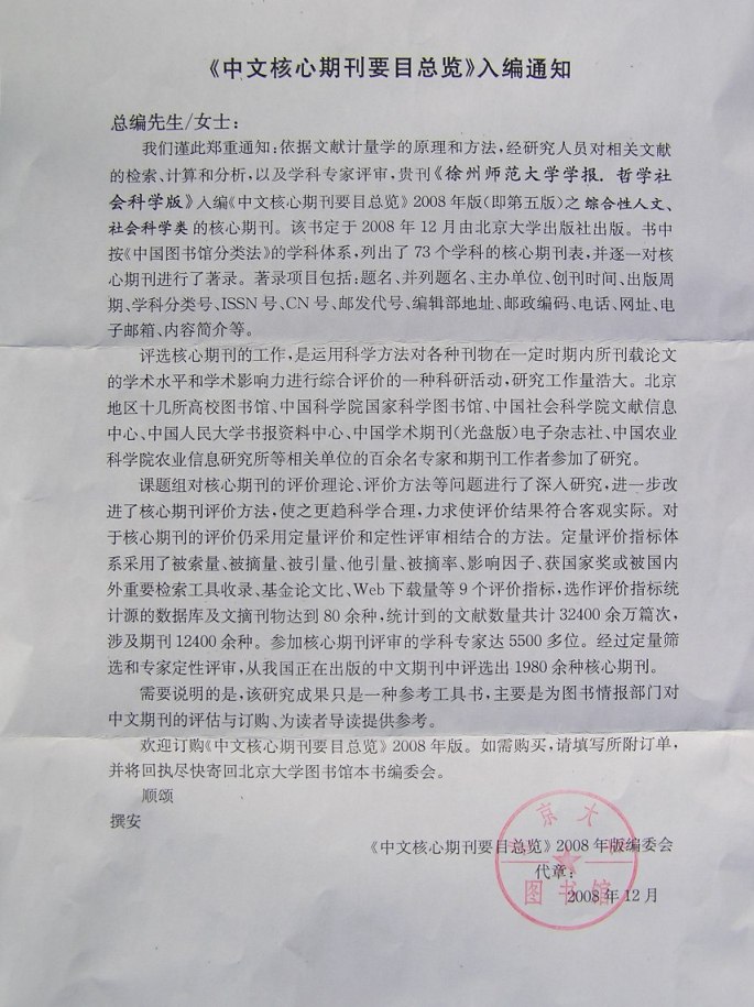 根据《中文核心期刊要目总览》2008年版编委会通知,《徐州师范大学学报》(哲学社会科学版)已入编《中文核心期刊要目总览》2008年版(即第五版)之综合性人文、社会科学类核心期刊。特向全校领导和师生报喜! 科技处、社会科学处 徐州师范大学学报学报编辑部(哲学社会科学版) 二〇〇八年十二月三十日