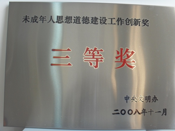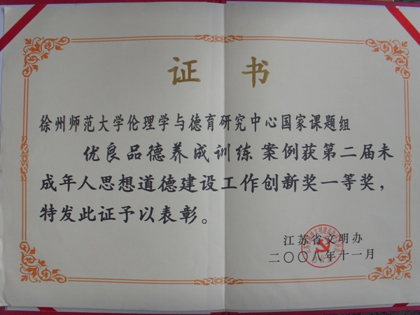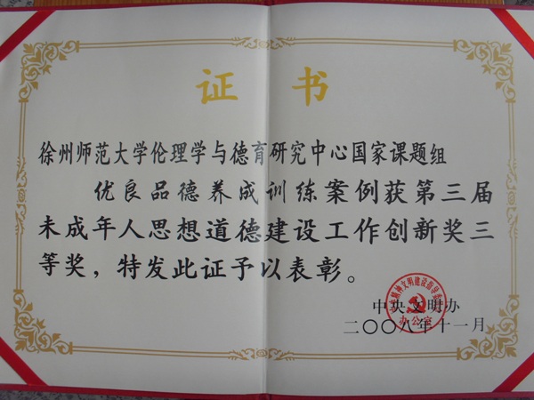 日前,校伦理学与德育研究中心接到中央文明办、江苏省文明办颁发的证书和奖金,该中心申报的科研成果“优良品德养成训练”获中央文明办举办的“全国第三届未成年人思想道德建设工作创新奖”三等奖(全国各类奖项共60项)。该成果同时获得江苏省文明办举办的“江苏省第二届未成年人思想道德建设工作创新奖”一等奖。