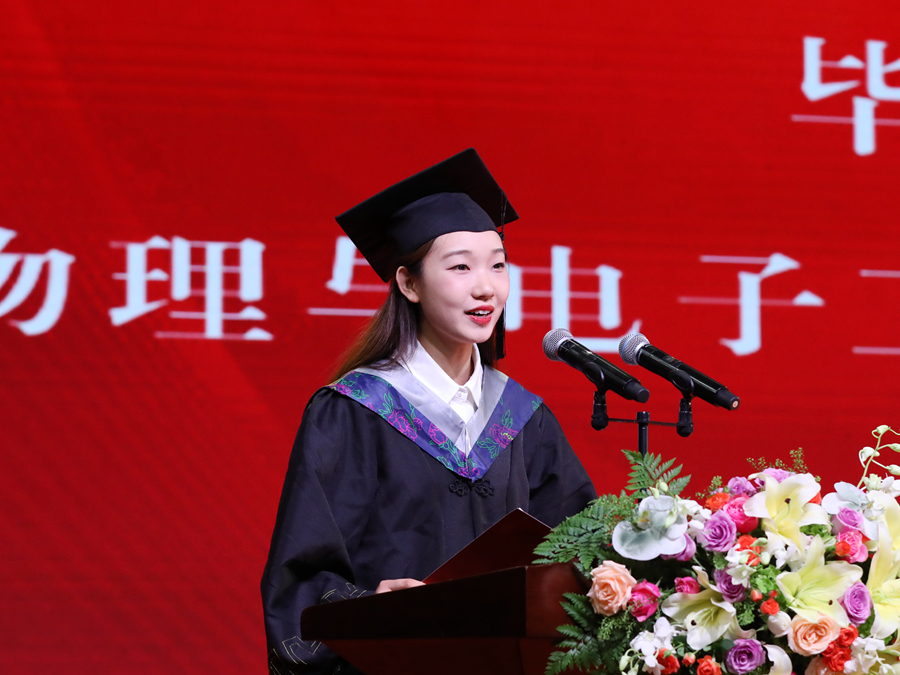 省三好学生、省优秀共青团员、省优秀毕业生、2023年度“苏师榜样”获得者 物理与电子工程学院任一冉同学作为毕业学生代表发言。她带领同学们一起深情回顾了大学生活的点滴,表达了对同窗、对师长、对母校的感恩与眷恋,同时也勉励同学们云程发轫、扬鞭策马,以昂扬的师大精神,热情奔赴下一场山海。