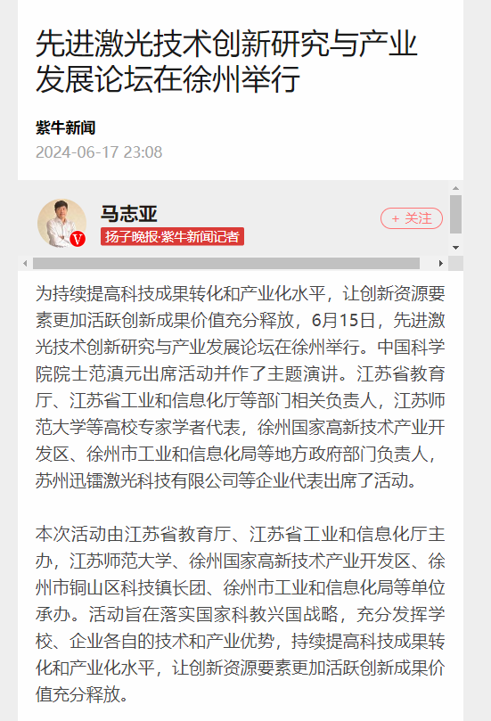 扬子晚报紫牛新闻6月17日报道在我校举办的先进激光技术创新研究与产业发展论坛,报道内容如下: