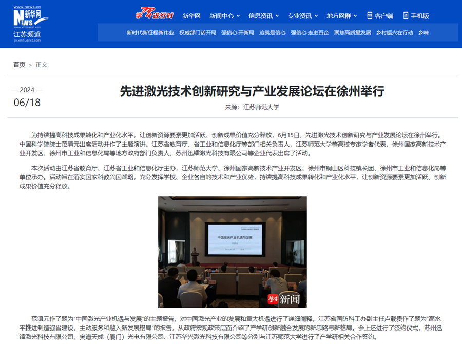 新华网江苏频道6月18日报道在我校举办的先进激光技术创新研究与产业发展论坛,报道内容如下: