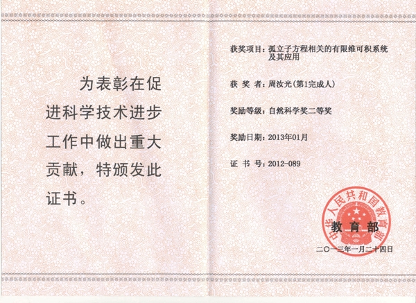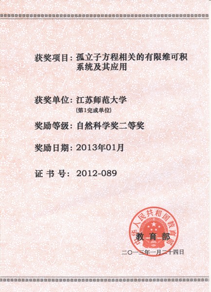 教育部日前公布《关于2012年度高等学校科学研究优秀成果奖(科学技术)奖励的决定》,以江苏师范大学为独立完成单位、副校长周汝光教授主持完成的科研成果“孤立子方程相关的有限维可积系统及其应用”获2012年度高等学校科学研究优秀成果奖自然科学二等奖。 高等学校科学研究优秀成果奖(科学技术)是教育部面向全国高等院校广大科技工作者设立的奖项,每年评审一次。2012年度,全国共有99项科研成果获高等学校科学研究优秀成果奖自然科学奖,其中一等奖36项、二等奖63项。