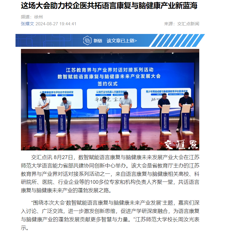 新华日报交汇点新闻8月27日报道我校举办的语言康复与未来健康产业发展大会,报道内容如下: