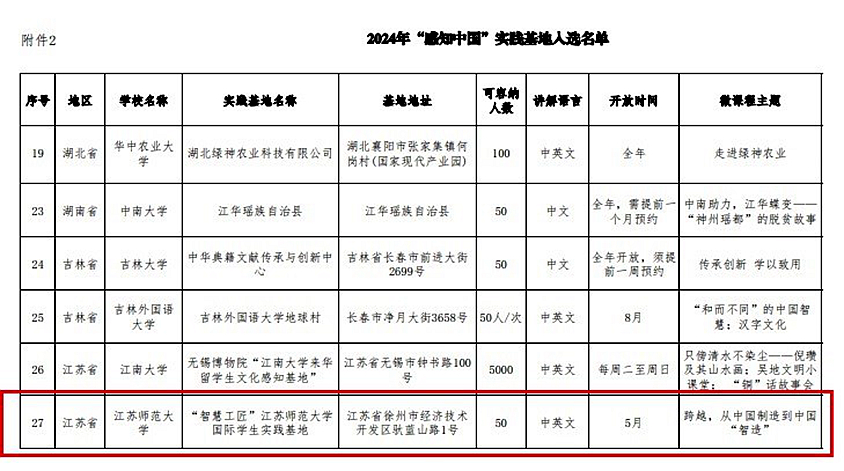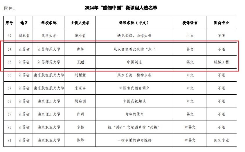 近日,国家留学基金管理委员会公布了2024年“感知中国”微课程与实践基地入选名单,我校国际学院曹妍老师讲授的《从汉画像看汉代的“龙”》、机电学院王虓讲授的《中国制造》两门微课程入选“感知中国”微课程名单,与徐工集团联合申报的“智慧工匠”江苏师范大学国际学生实践基地入选“感知中国”实践基地名单,实现了我校来华留学工作的又一重要突破。