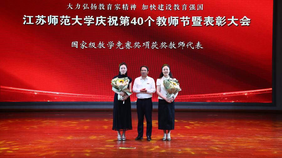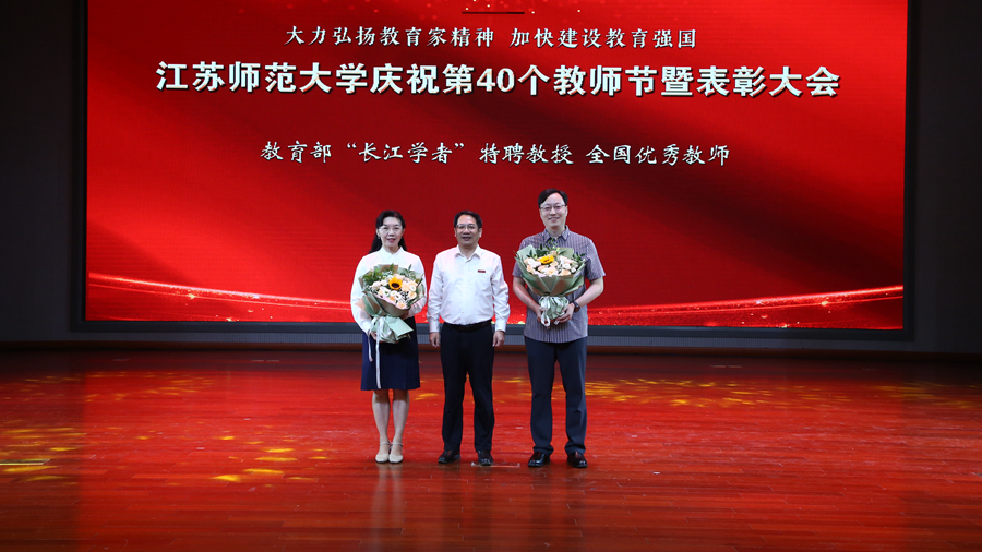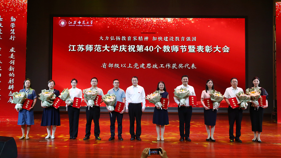 校党委书记方忠在表彰大会上致辞,代表学校党政向全校教师和奋战在教育教学一线和管理服务岗位的教职员工致以崇高的敬意和节日的问候,向全体新入职的教职工们表示热烈的欢迎。他指出,2023年教师节前夕,习近平总书记致信全国优秀教师代表时提出了中国特有的教育家精神,为新时代教师队伍建设指明了前进方向、提供了根本遵循。党的二十届三中全会对进一步全面深化改革推进中国式现代化进行了系统擘画,提出“教育、科技、人才是中国式现代化的基础性、战略性支撑”,并对深化教育综合改革作出部署。方忠勉励全体教职工,要坚定信念,涵养高尚情操,强化“师德”之本;要以生为本,潜心教书育人,恪守“人师”之道;要求是创新,练就过硬本领,筑牢“强师”之基。他希望广大教师深刻领会高校作为教育、科技、人才重要结合点的基础性、战略性支撑作用,进一步聚焦我校“特色鲜明、国内一流、国际知名的高水平师范大学”建设目标,凝心聚力擘画奋进蓝图,团结一致推动高质量发展,为中国式现代化的宏伟事业贡献江苏师范大学的力量。