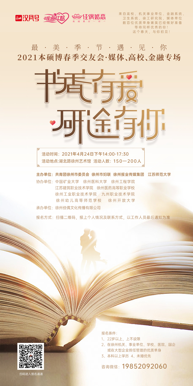 各基层妇联、工会:为给我校单身教职工搭建相识相知、沟通交流的平台,提供增进了解的机会,共青团市委、市妇联、市报业集团、江苏师大及在徐高校等多家单位联合举办“书香有爱,研途有你”2021本硕博春季交友会。活动时间:2021年4月24日14:00-17:30活动地点:湖北路徐州艺术馆报名方式:海报扫二维码填写报名信息 烦请各基层妇联主席转发各部门(学院),通知相关教职工参加。 校妇联、工会 2021年4月20日