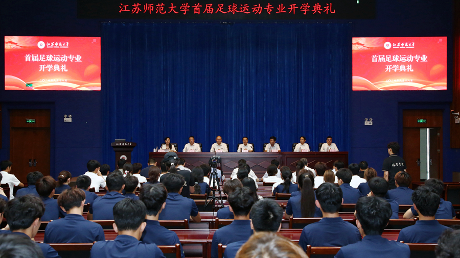 9月18日,我校首届足球运动专业本科生开学典礼在泉山校区隆重举行,省教育厅二级巡视员、省学生体育协会主席李金泉,省体育局副局长、省足球运动协会主席刘彤,校党委书记方忠,校长周汝光,副校长张玉勤、赵鹏,徐州市教育局、体育局有关领导出席典礼,学校相关职能部门负责同志,体育学院教师代表,首届足球运动专业全体新生,往届足球专项学生及毕业生代表参加典礼。