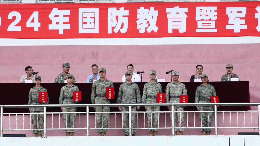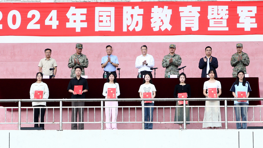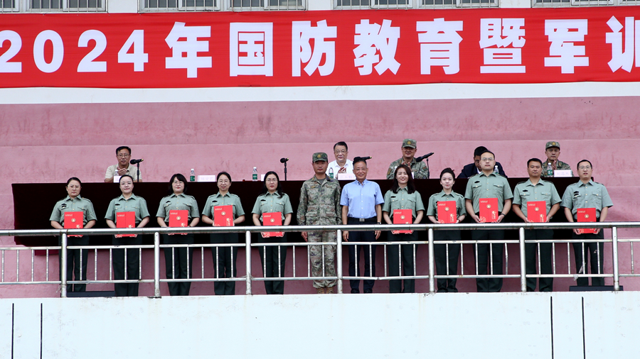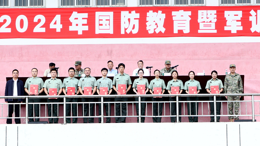 李军在讲话中结合我校军训工作开展情况,对全体学员提出了希望,就军地合作提出了愿景。孟召学宣读了表彰文件。出席活动的领导为2024年国防教育工作先进单位、军训优秀教官、军训优秀管理干部、军训工作先进个人和“爱我国防”征文比赛获奖代表颁发了证书。学校国旗班、队列、军体拳方队进行了训练成果展示,武术表演方阵展示了精彩的民族传统武术。