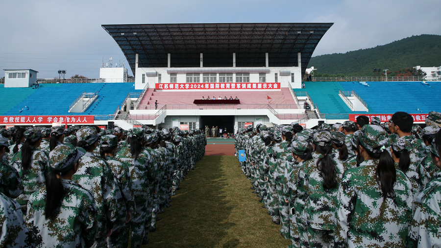 为进一步总结和推进学校国防教育工作,展示2024级学生军训成效,9月29日上午,我校2024年国防教育暨军训成果展示活动在泉山校区田径场举办。校党委常委、副校长张玉勤出席活动并讲话,校党委常委、宣传部部长孟召学,驻徐某部副旅长李军上校,承训部队教官代表、党委学生工作部、党委武装部等职能部门负责人出席活动,各学院党委副书记、国防教育辅导员、获奖学生代表和2024级参训学生等参加活动。