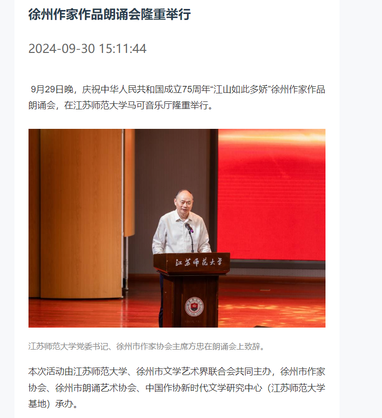 本次活动由江苏师范大学、徐州市文学艺术界联合会共同主办,徐州市作家协会、徐州市朗诵艺术协会、中国作协新时代文学研究中心(江苏师范大学基地)承办。