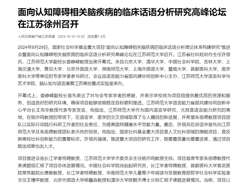 人民日报客户端10月10日报道我校举办的面向认知障碍相关脑疾病的临床话语分析研究高峰论坛,报道内容如下: