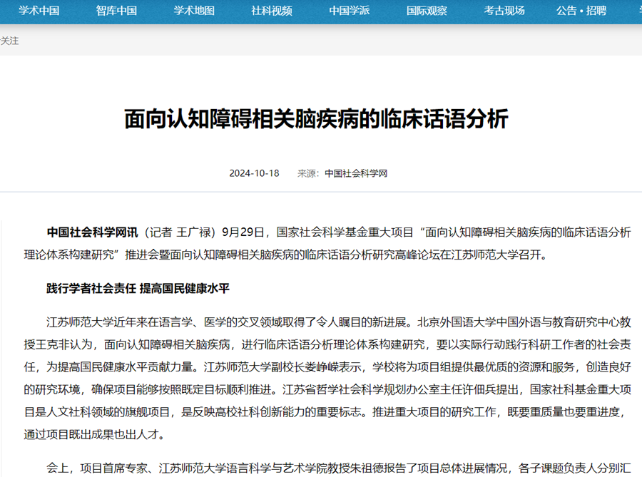 中国社会科学网10月18日报道我校举办的“面向认知障碍相关脑疾病的临床话语分析理论体系构建研究”推进会暨面向认知障碍相关脑疾病的临床话语分析研究高峰论坛,报道内容如下: