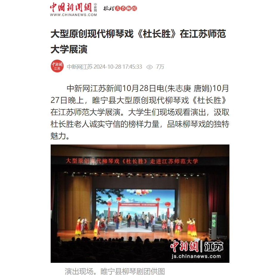 中国新闻网10月28日报道在我校演出的大型原创现代柳琴戏《杜长胜》,报道内容如下: