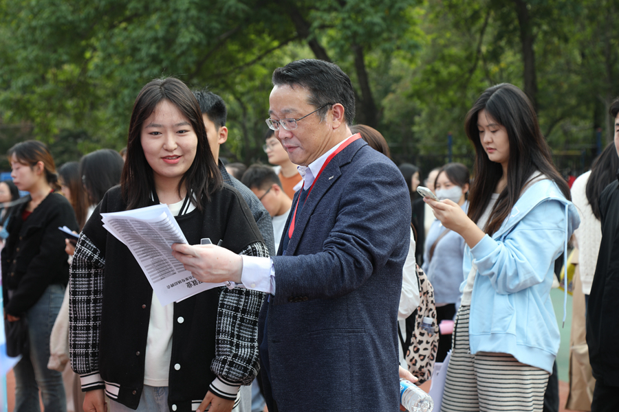 张玉勤和黄炜等领导老师也来到现场走访调研,了解用人单位的基本概况、发展规模以及招聘安排等,开展了“访企拓岗”,积极推荐我校毕业生。他们还与现场毕业生们进行交流,了解他们的就业意愿和就业规划,指导求职学生完善简历,鼓励他们树立正确的择业和就业观念,积极响应“服务新质生产力”的号召,将个人成长融入国家、社会发展的大局之中,为自己的科技创新、专业技能、综合素养找到施展的舞台。
