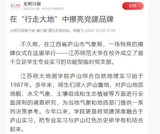 不久前,在江西省庐山市气象局,一场特殊的揭牌仪式在这里举行——江苏师范大学在校外成立了首个立足学生专业实习的功能型临时党支部。