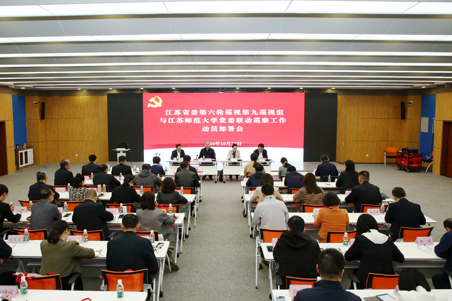 校长、巡察工作领导小组副组长周汝光同志宣读《关于开展江苏省委第六轮巡视第九巡视组与江苏师范大学党委联动巡察工作的通知》。本次联动巡察设3个联动巡察组,分别由3位校领导任组长,采取“延伸式”联动和“接力式”联动相结合的方式对生命科学学院党委、江苏圣理工学院-中俄学院党委、产业党总支(资产经营有限公司、汉园宾馆、大学科技园)等三家单位开展联动巡察。参与第三届党委第一轮巡察的物理与电子工程学院党委书记王夫寿、科文学院党委副书记丁力、教育科学学院(教师教育学院)党委秘书马雪梅分别作经验交流。