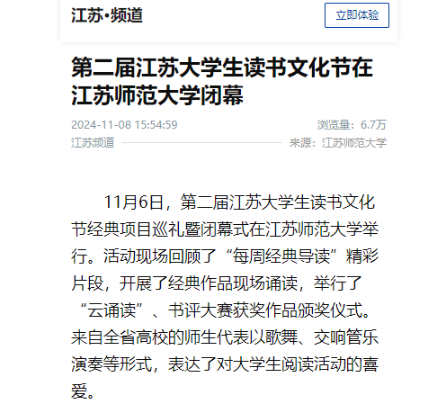 新华社客户端11月8日报道在我校举办的第二届江苏大学生读书文化节经典项目巡礼暨闭幕式,报道内容如下: