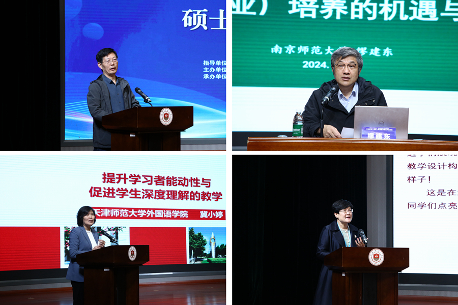 南京师范大学外国语学院院长王永祥教授主持主旨报告环节。全国教育专业学位研究生教育指导委员会副主任缪建东、天津师范大学外国语学院院长冀小婷、江苏省盐城中学原党委副书记、副校长、特级教师朱俊分别以“教育硕士人才培养的机遇与挑战”“提升学习者能动性与促进学生深度理解的教学”“从技能大赛看英语教师课堂教学能力提升新路径”为题作主旨报告。