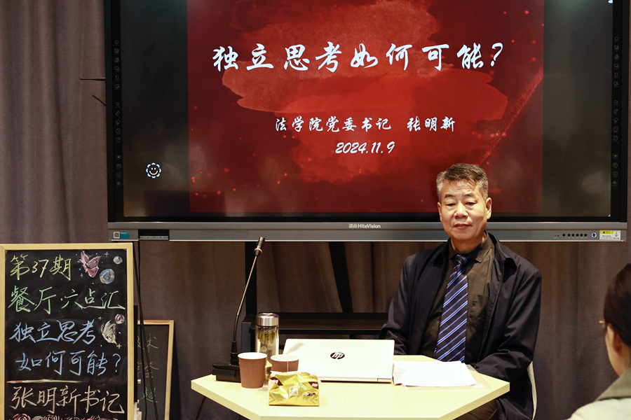 11月9日下午,第37期“餐厅•六点汇”活动在泉山校区“餐厅·六点汇”实践基地举行。法学院党委书记张明新就“独立思考如何可能”这一主题与在场同学进行交流。