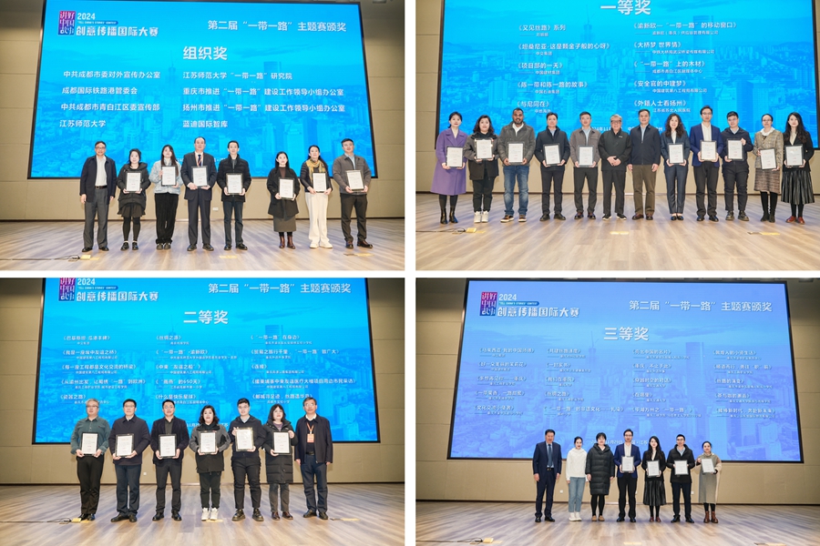 会上,还发布了第二届“讲好中国故事”创意传播国际大赛“一带一路”主题赛45件获奖作品名单及8个组织奖获奖名单并颁奖。其中,一等奖作品10件,二等奖作品15件,三等奖作品20件。