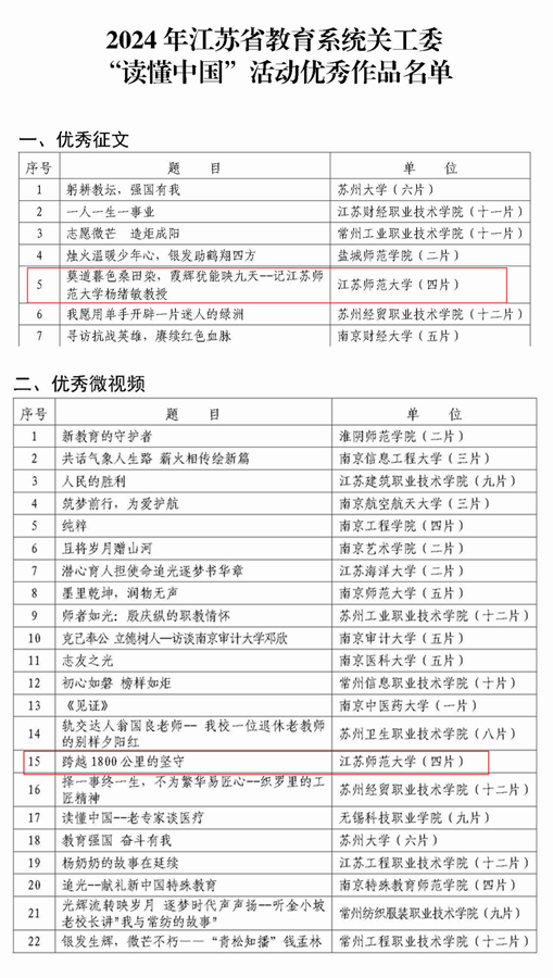 近日,江苏省教育系统关工委发布《关于公布2024年“读懂中国”活动入选作品名单的通知》(苏教关委〔2024〕14号),经层层遴选,多轮评审,全省共评选出优秀征文25篇、优秀微视频22部。我校遴选推荐的作品入选2件,其中由历史文化与旅游学院关工委报送的作品《莫道暮色桑田染,霞辉犹能映九天——记杨绪敏教授》获评“优秀征文”奖,由电气工程及自动化学院关工委报送的作品《跨越1800公里的坚守——记刘海宽教授》获评“优秀微视频”奖。