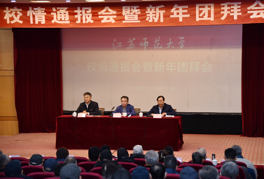 祥龙回首留胜景,金蛇起舞贺新程。2024年12月31日上午,校离退休教职工校情通报会暨新年团拜会在泉山校区敬文报告厅举行。校党委书记芮国强,校党委副书记、校长杜增吉,校党委副书记蔡国春,校关心下一代工作委员会委员单位主要负责人出席会议;省管离退休干部代表,离退休党委委员、支部委员和党员代表,校关工委老同志委员及职能组负责人代表,校老年协会负责人,具有高级职称的离退休教职工及党外人士代表,离退休工作部(处)全体工作人员两百余人欢聚一堂,共贺新年。蔡国春主持会议。