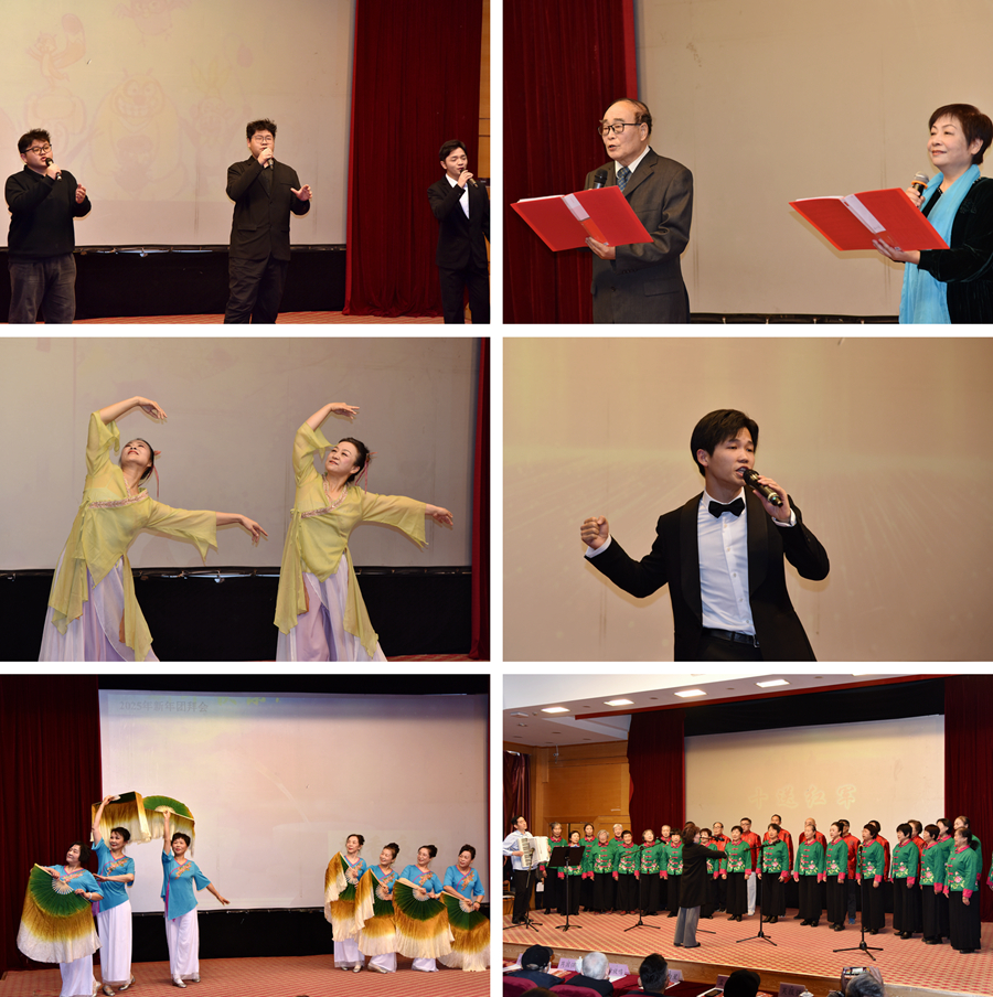 校情通报会后,精彩纷呈的文艺表演将团拜会的气氛推向高潮。老同志们自编自演的节目形式多样又各具特色,歌曲、舞蹈、朗诵等轮番登场。舞蹈《拜个吉祥年》《我们的生活充满阳光》欢快喜庆,拉开团拜会文艺演出的序幕;歌曲《我的祖国》深情悠扬,唱出了老一辈对祖国深沉的爱;诗朗诵《秋天里的中国》展现祖国波澜壮阔的发展历程,抒发了对往昔岁月的怀念和对未来的美好憧憬,赢得了阵阵掌声和喝彩声。4位充满青春朝气的校园“十佳歌手”为老同志们献上多首动听的歌曲,他们代表全校青年学子向所有辛勤耕耘半生、仍在默默奉献的老一辈师长们致以最诚挚的敬意,精彩的表演让现场老同志沉浸在青春的独特魅力和跨越年龄、老少同乐的美好氛围中。团拜会在离退休教职工大合唱《春风十万里》《十送红军》的悠扬歌声中,在温馨、和谐、欢乐的气氛中圆满结束。
